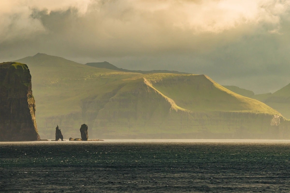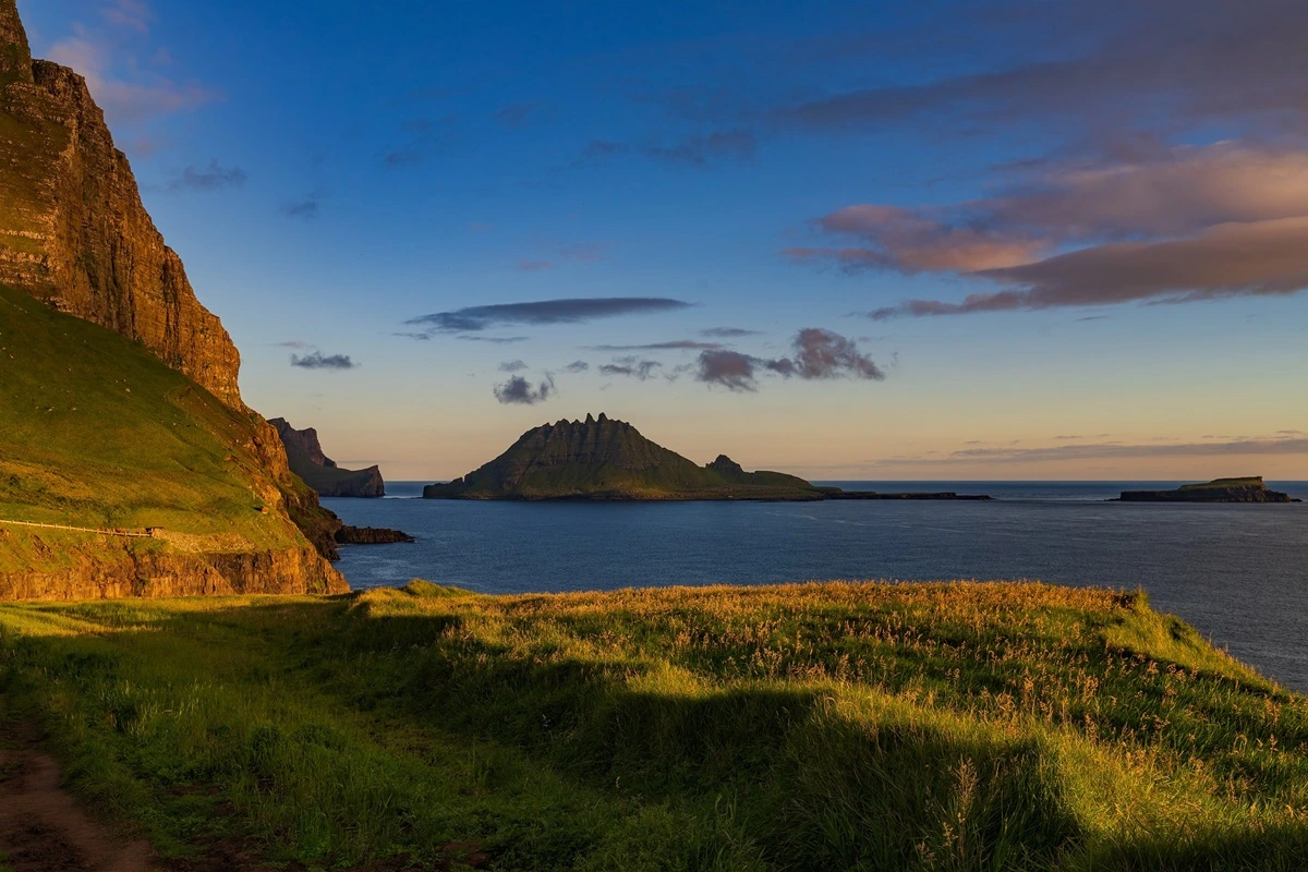 The island of Eysturoy offers some of the most dramatic coastal driving in the country. Near Eiði, you can view the famous sea stacks known as Risin and Kellingin rising from the ocean.